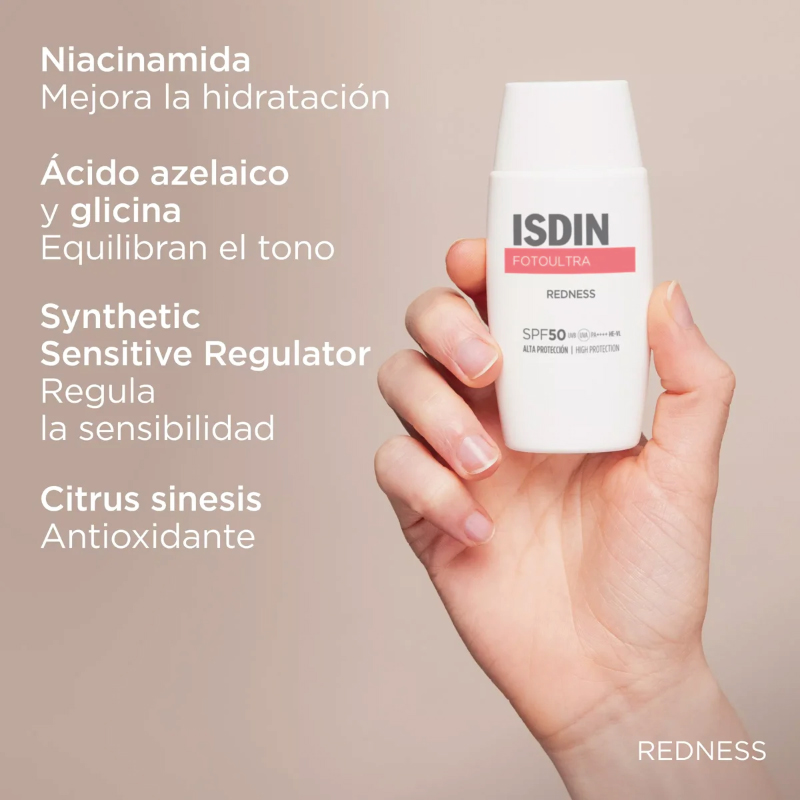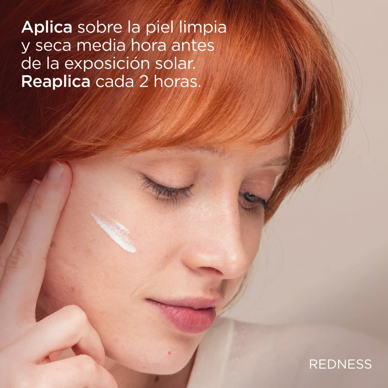 Corrige y ayuda a prevenir las rojeces de la piel con Redness SPF 50, el protector solar de textura ligera que aporta una alta protección contra los rayos UVB/UVA y la luz visible. Contribuye a calmar la sensación de irritación de forma inmediata.