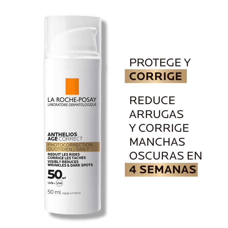 Anthelios Age Correct SPF50+, Es una nueva fórmula avanzada que ayuda a proteger y corregir los signos del foto envejecimiento causados por la exposición diaria a los rayos ultravioleta, además de corregir la hiperpigmentación foto inducida.