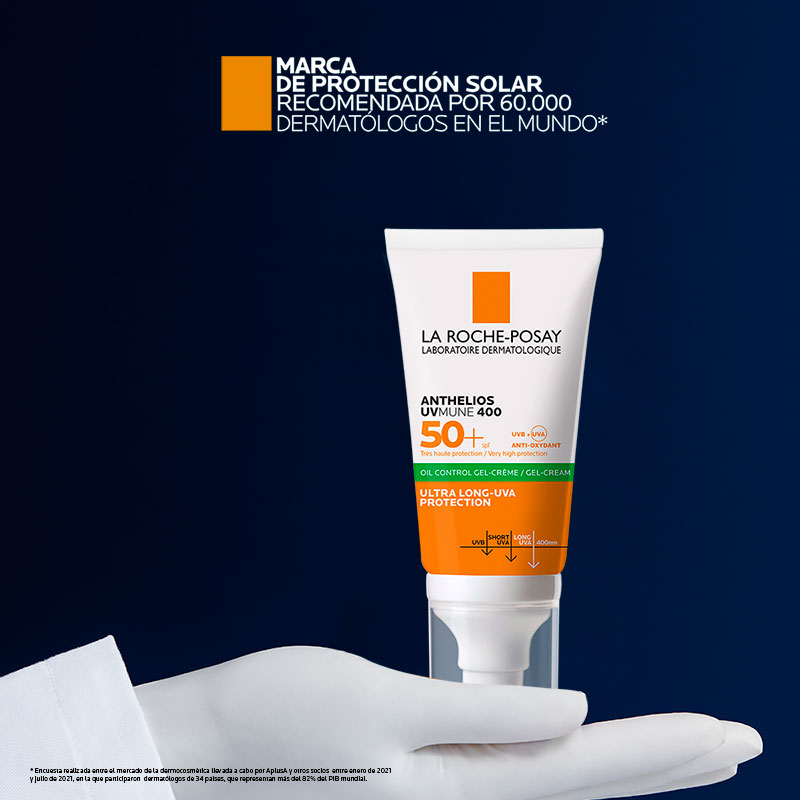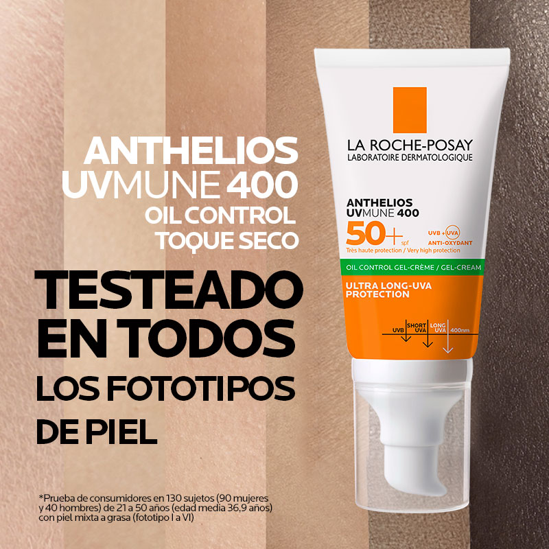 Protector solar para piel mixta a grasa. Alta protección sin dejar marcas blancas. Efecto mate todo el día (Autoevaluación, uso 2 veces al día), muy alta protección UVA/UVB/IR, control inteligente de brillo y sudor.