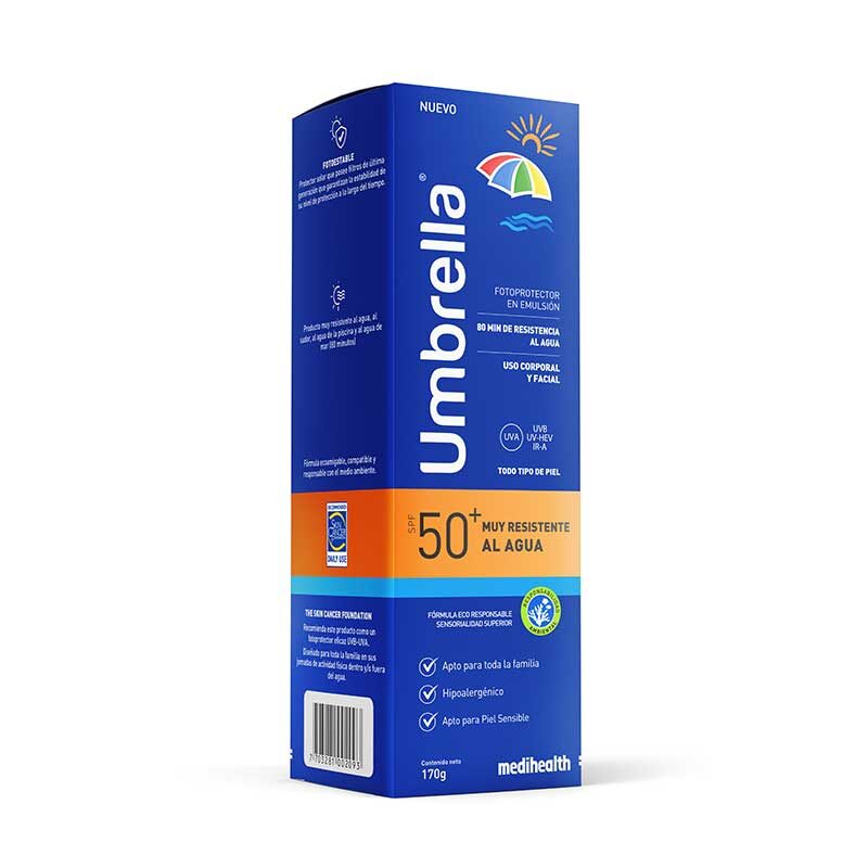 Umbrella muy resistente al agua SPF 50+, fotoprotector alatamente especializado brinda alta resistencia al agua o sudor, hasta por 80 minutos de inmersión.