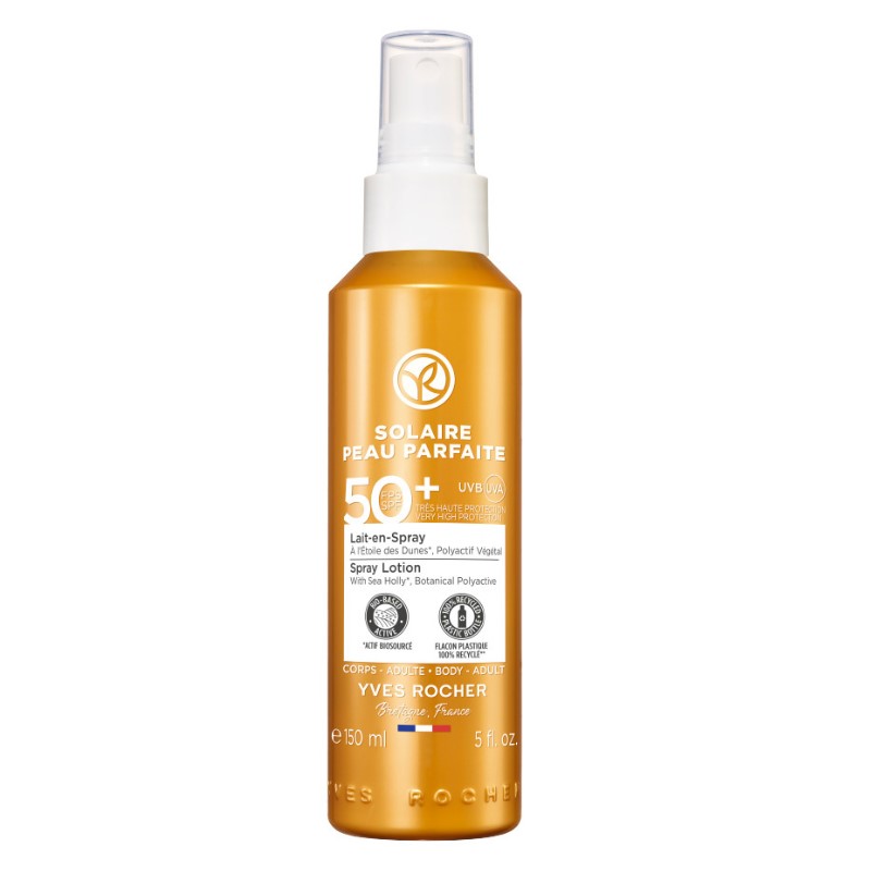 Este protector solar en spray FPS 50, resistente al agua, protege eficazmente la piel contra los rayos UVA/UVB y el fotoenvejecimiento.
